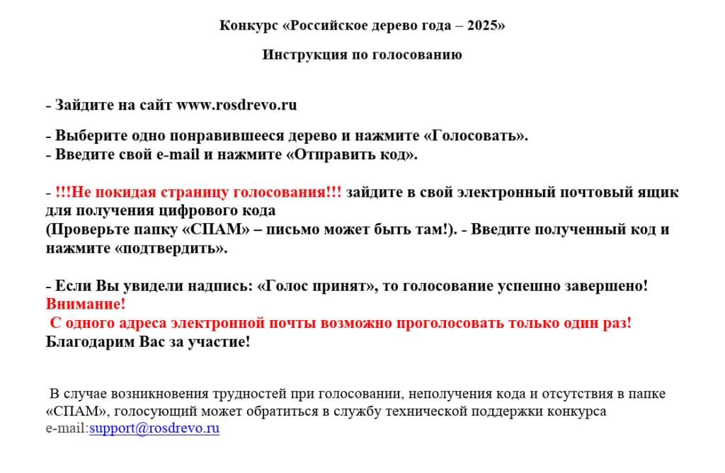 Проголосовать за главное дерево страны можно на сайте Всероссийской программы «Деревья — памятники живой природы» www.rosdrevo.ru до 1 августа 2025 года.