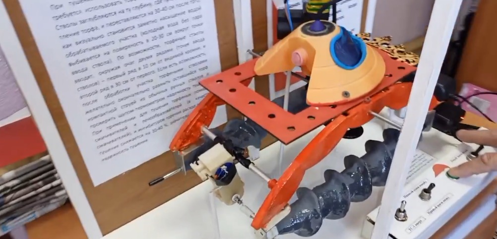 – Ранее я делала несколько моделей шнекоходов, но в январе 2025 года решила смоделировать пожарный шнекоход для тушения пожаров на торфяниках, — говорит юная моделистка. — Мне помогали мои сестры Таисия и Алена и подруги Вероника Блохова и Анна Архипова, которые тоже занимаются в кружке. Шнекоход состоит из платформы, к которой вместо колес и гусениц крепятся два шнека цилиндрической формы, полые внутри, кабина от старой машинки, внутри которой находится бочка для воды или пены, и труба, соединенная с бочкой. Модель приводится в движение при помощи электродвигателя постоянного тока (6 Вт). В действии шнекоход должен заехать на торфяник, при помощи трубы проделать отверстия в торфе, куда из бочки будет подаваться вода или пена, которые затушат пожар. Изготовлением модели мы занимались два месяца. Дедушка подал заявку на участие в конкурсе, в котором я заняла первое место.