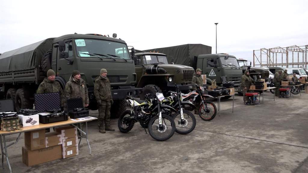 Представители Главного организационно-мобилизационного управления Генерального штаба РФ вручили отрядам «БАРС» ключи от автомобилей, кроссовых мотоциклов, а также передали аппаратные комплексы подавления каналов управления беспилотных летательных аппаратов противника.