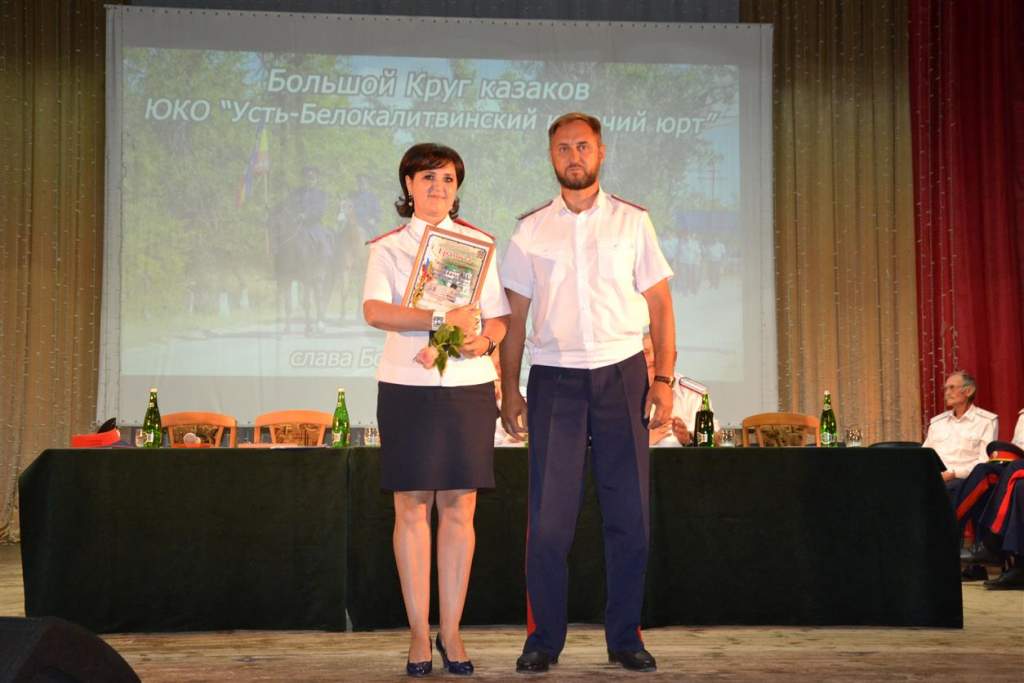 Глава администрации Белокалитвинского района и заместитель атамана Окружного казачьего общества «Донецкий округ» О.А. Мельникова и юртовой атаман Н.А. Тимошенко вручили казакам и казачкам Почетные грамоты за активное участие в развитии Донского казачества на Белокалитвинской земле.